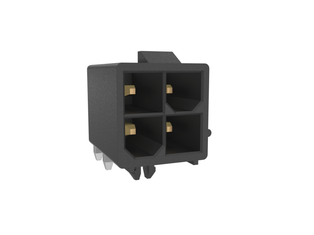 Minitek®Pwr 4.2, Dual Row, Right Angle Through Hole Header, 30μin Gold plating, Black Color, 4 Positions, Non GW Compatible Nylon66, With Pegs, Tape and Reel.
