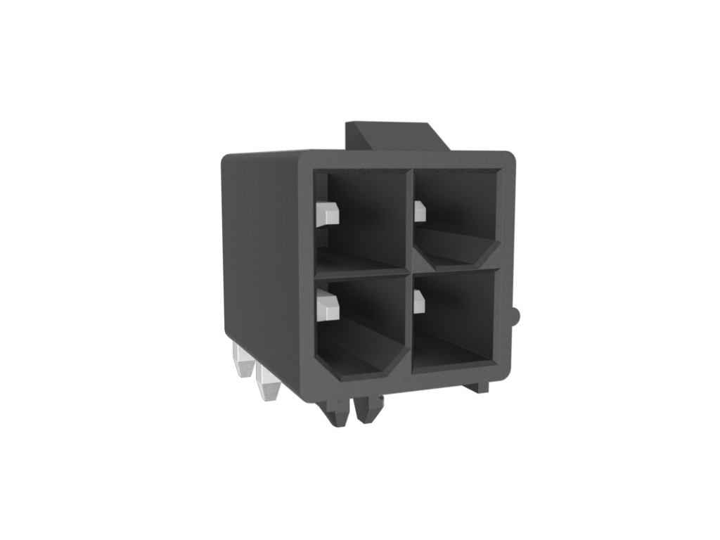 Minitek®Pwr 4.2 HCC, Dual Row, Right Angle Through Hole Header, 100μin Matte Tin plating, Black Color, 4 Positions, Non GW Compatible Nylon66, Tray Packing, With Pegs.