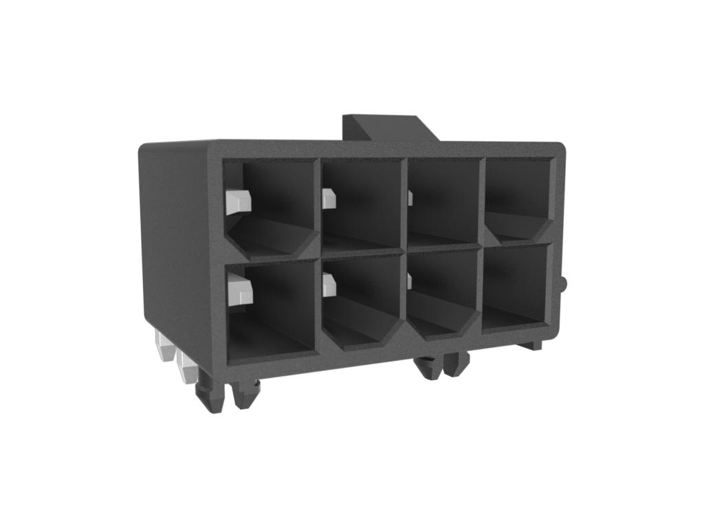 Minitek®Pwr 4.2 HCC, Dual Row, Right Angle Through Hole Header, 100μin Matte Tin plating, Black Color, 8 Positions, GW Compatible Nylon66, Tray Packing, With Pegs.