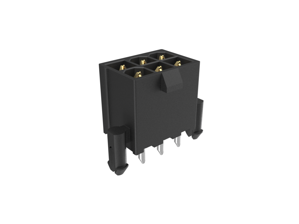 Minitek®Pwr 4.2 HCC, Dual Row, Vertical Through Hole Header, 30μin Gold on Contact area (100μin Matte Tin on Tails) plating, Black Color, 6 Positions, LCP, GW Compatible, Tray Packing, With Pegs.