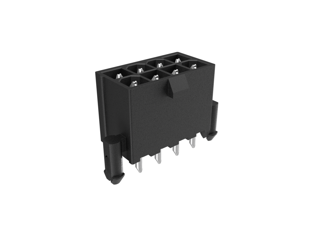 Minitek®Pwr 4.2 HCC, Dual Row, Vertical Through Hole Header, 100μin Matte Tin overall plating, Black Color, 8 Positions, LCP, GW Compatible, Tray Packing, With Pegs.