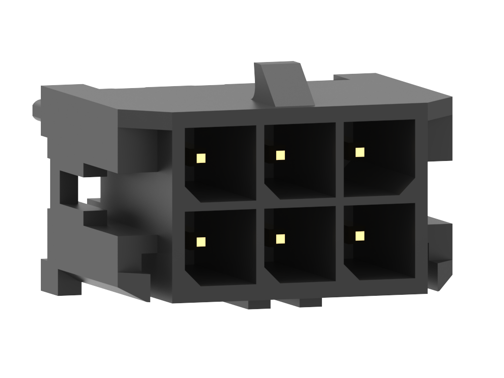Minitek®Pwr 3.0 HCC, Dual Row, Vertical Through Hole Header, 6 Positions, Gold Flash plating, Black Color, GW Compatible PA9T, Tape and Reel, with Straight Tail.