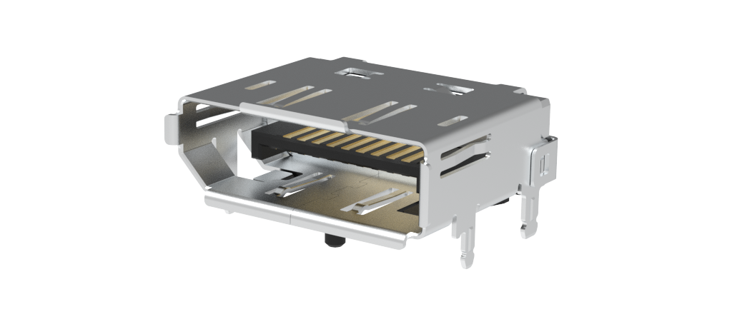 Enhanced full size Display Port, UHBR20 Right Angle, Surface Mount, without flange, 15μin gold