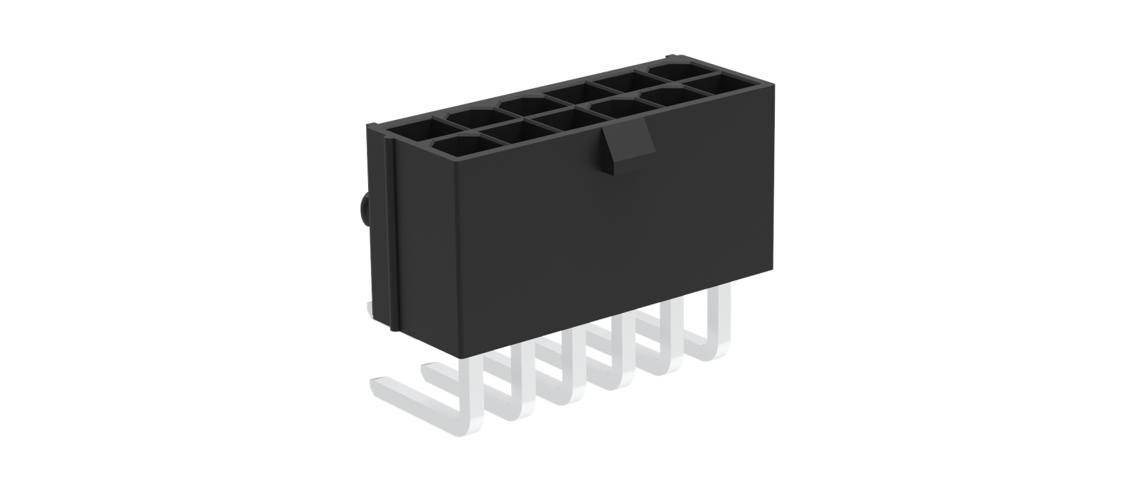 Mini power, Right Angle, Dual row, 4.2mm pitch, 12 positions , 100μin Tin, 3.60mm tail length, LCP, Black, TRAY