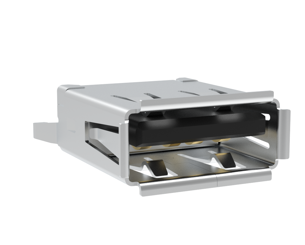 USB 2.0, Type A, Receptacle, Vertical, 4 Pins, Shell with Nickel Plating, Gold Flash, Dip 2mm, Black Housing, Tray Packaging