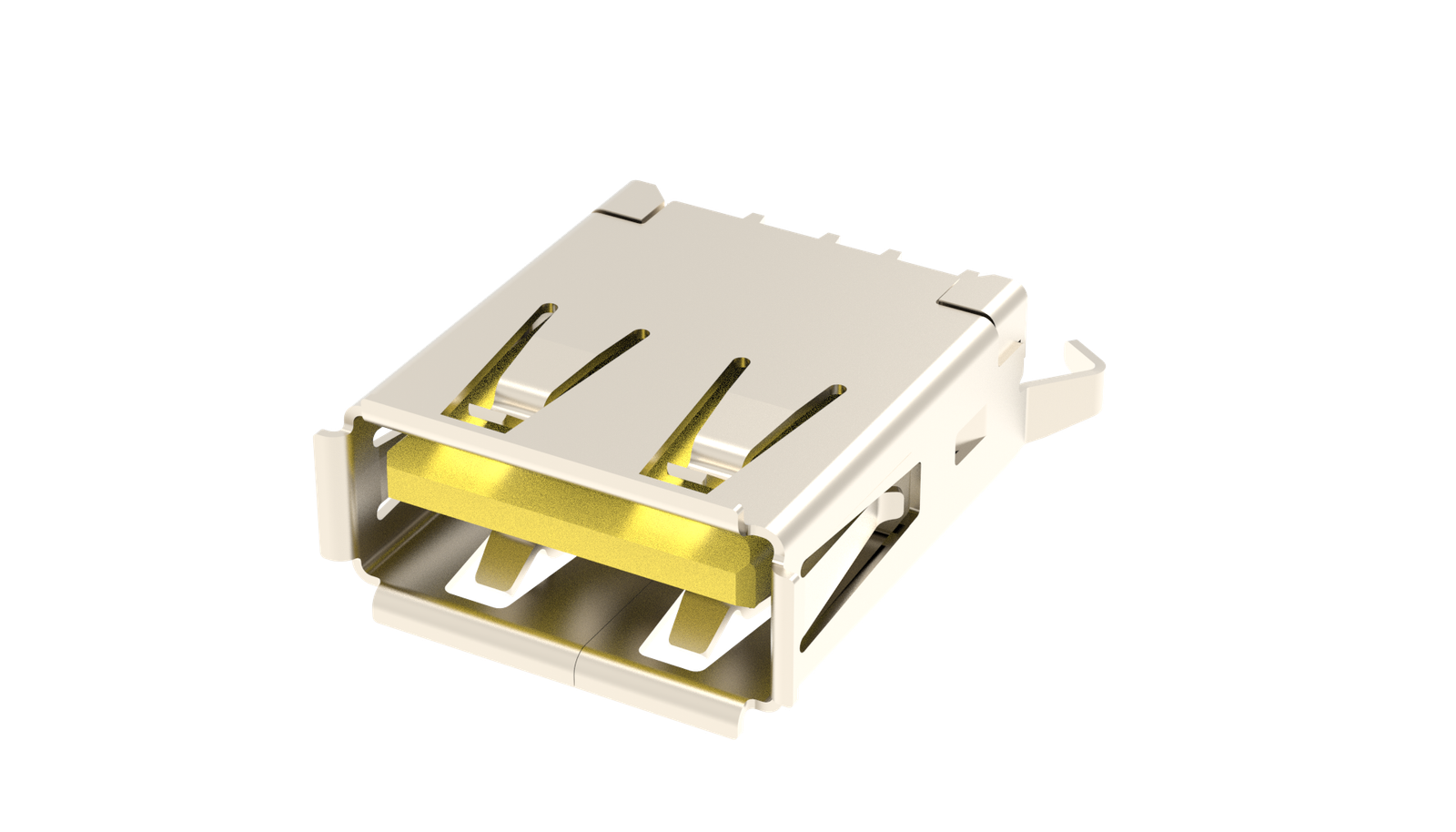 USB 2.0, Type A, Receptacle, Vertical, 4 Pins, Shell with Nickel Plating, 30μin Gold, Dip 2.7mm, Yellow High temperature Housing, Tray Packaging