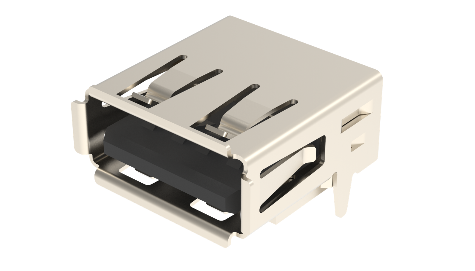 USB 2.0, Type A, Receptacle, Right Angle SMT, 4 Pins, Shell Dip with Nickel Plating, 30μin Gold, Black Housing, Tape and Reel Packaging