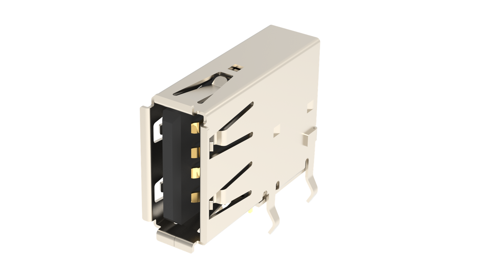USB 2.0, Type A, Receptacle, Upright, 4 Pins, Shell Kink with Nickel Plating, Gold Flash, Dip 2.4mm, Black Housing, Tray Packaging