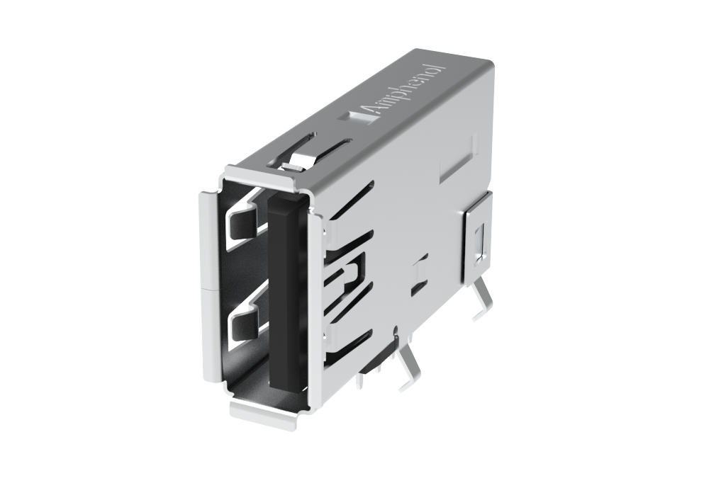 USB 2.0, Type A, Receptacle, Upright, 4 Pins, Shell Kink with Nickel Plating, 30μin Gold, Dip 4.4mm, Black High Temperature Housing, Tray Packaging