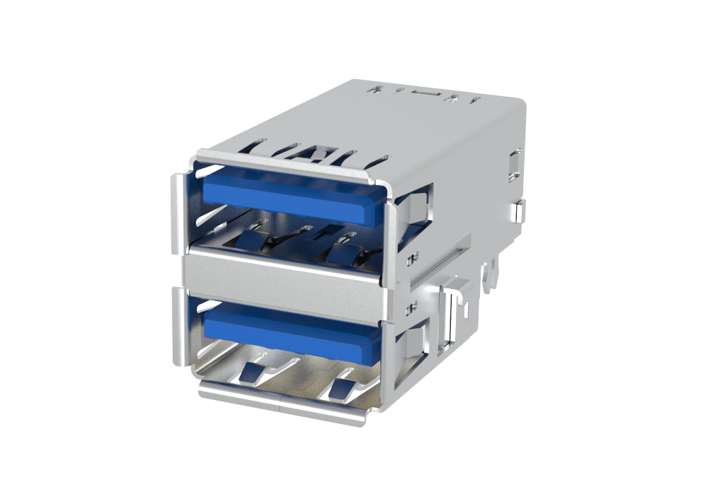 USB 3.2, Type A, Receptacle, Right Angle Stacked Sink, 9.91mm Height, 18 Pins, Shell with Nickel Plating, Shell Dip Pitch 15.6mm, 30μin Gold, Dip 2.4mm, Blue High Temperature Housing, Tray Packaging