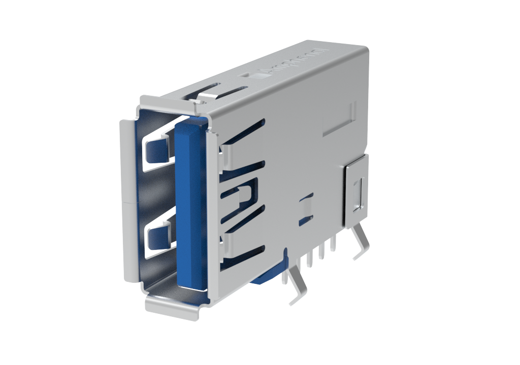 USB 3.2, Type A, Receptacle, Upright Reverse, 9 Pins, Shell Kink with Nickel Plating, 30μin Gold, Dip 1.9mm, Blue High Temperature Housing, Tray Packaging