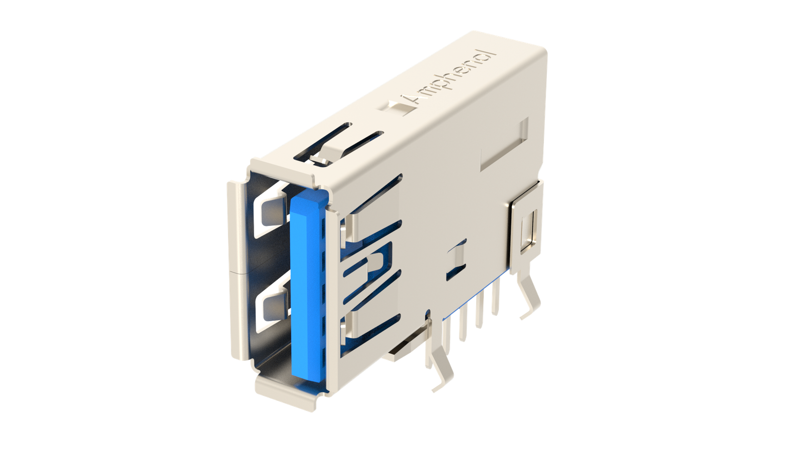 USB 3.2, Type A, Receptacle, Upright Reverse, 9 Pins, Shell Kink with Nickel Plating, 30μin Gold, Dip 3.3mm, Blue High Temperature Housing, Tray Packaging
