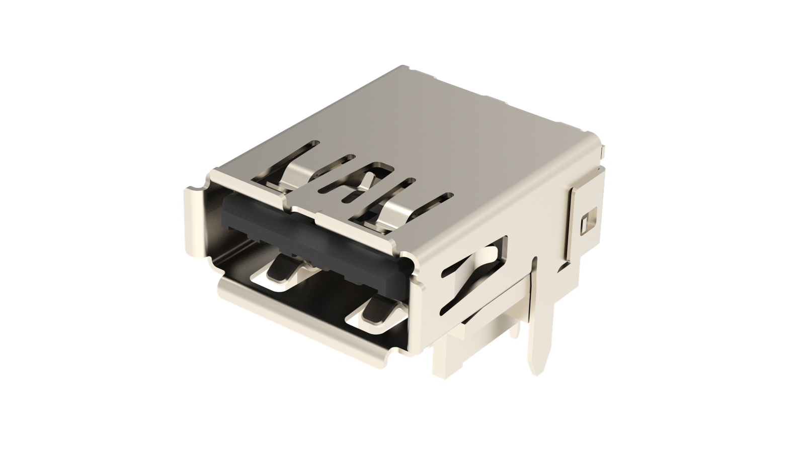 USB 3.2, Type A, Receptacle, Right Angle, High Rise, 9.73mm Height, 9 Pins, Shell Dip with Nickel Plating, 30μin Gold, Dip 2.5mm, Black High Temperature Housing, Tray Packaging