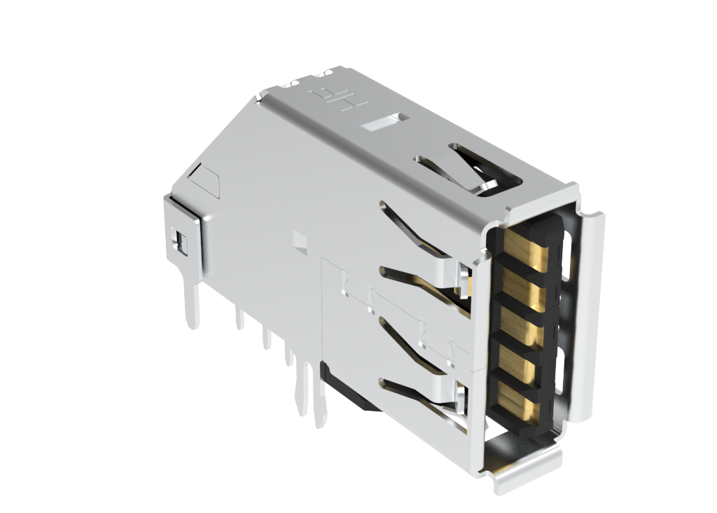 USB 3.2, Type A, Receptacle, Upright Reverse, 9 Pins, Shell Forklock with Nickel Plating, 30μin Gold, Dip 2.4mm, Blue High Temperature Housing, Tray Packaging