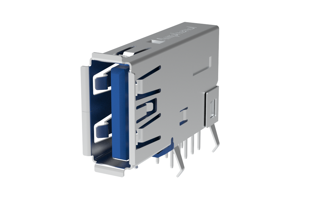 USB 3.2 GEN2, Type A, Upright Reverse, 9 Pins, Shell Kink with Nickel Plating, 30μin Gold, Dip 3.1mm, Blue High Temperature Housing, Tray Packaging