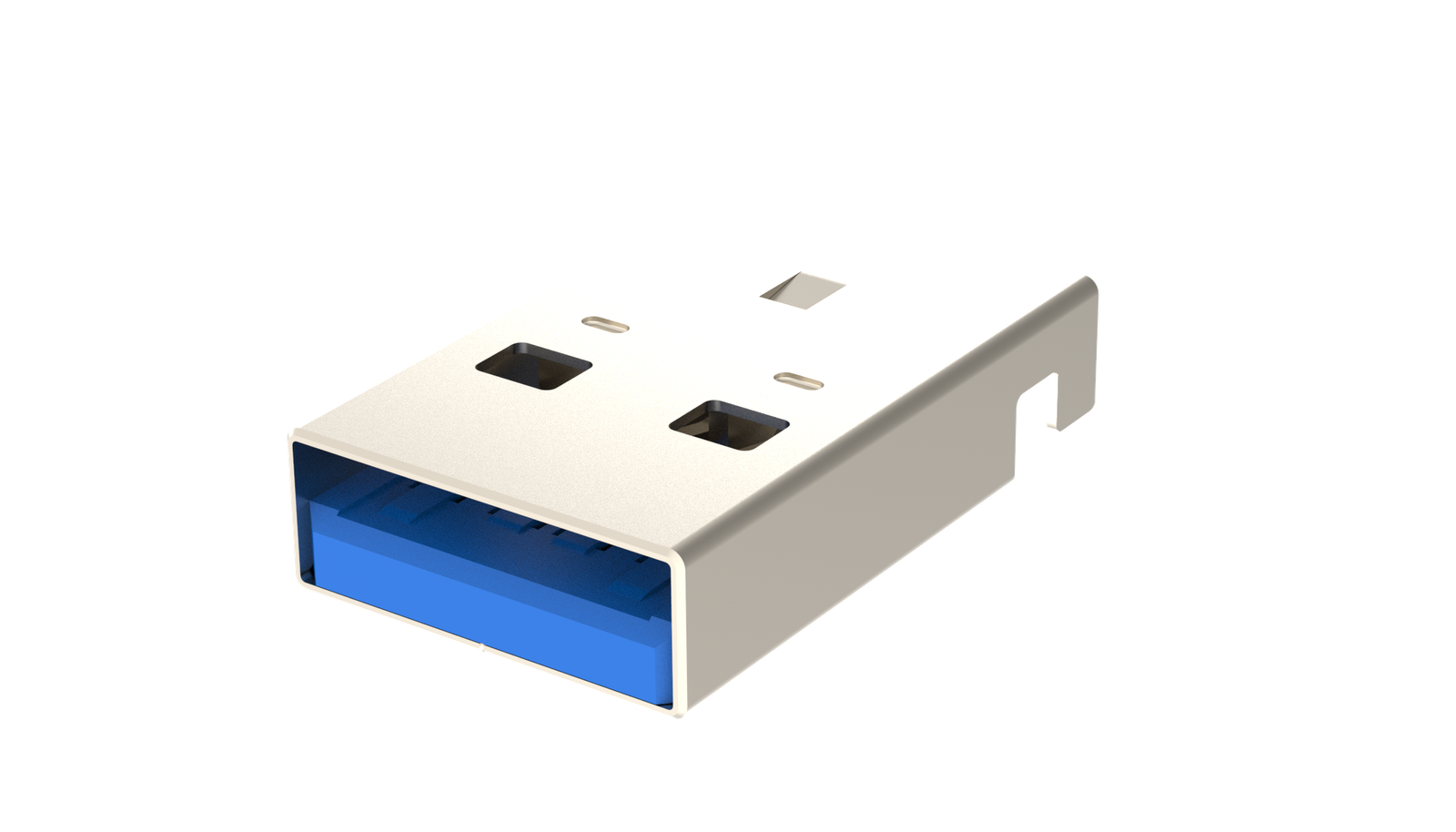 USB 3.2 GEN 2, Type A, Plug, Right Angle SMT, 9 Pins, Offset 0.3mm, 1.9mm Height, Shell Dip with Nickel Plating, 30μin Gold, Blue High Temperature Housing, Tape and Reel Packaging