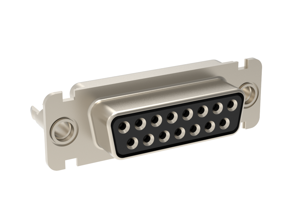 Dsub, Machined signal 7.5A, Straight PCB Thru Hole, Cnt Length=5.5mm (.217in), Cnt =0.6mm (.024in), 15 Socket, Bright Tin Shell, 0.76μm (30μin) Gold, 4-40 Standoff, With Boardlock.