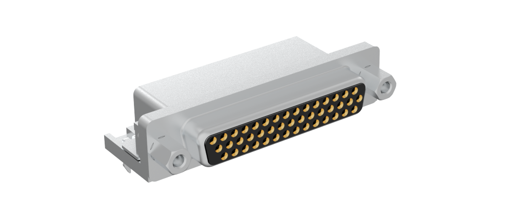 Dsub, Stamped Signal 3A, High Density, Right Angle PCB Through Hole, FP=8.89mm (0.35μin), 44 Socket, 0.38m (15 in) Gold, 4-40 Front Screwlock, Ground Tab, With Boardlock