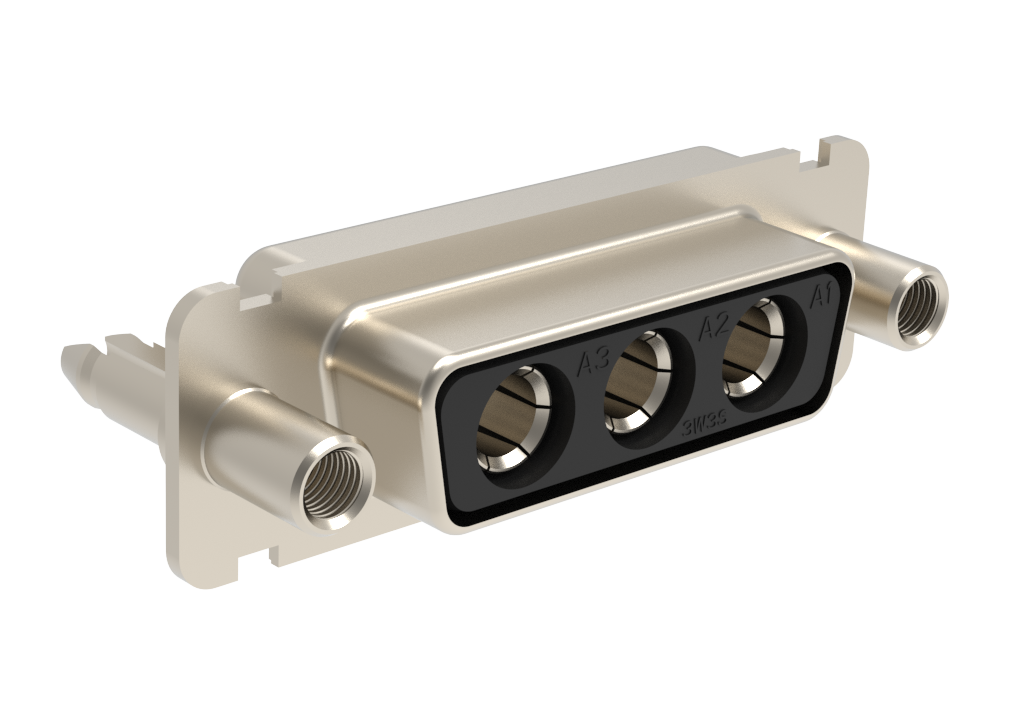 Dsub, Machined Hybrid, 3W3, Power (40A) Contacts Only, Socket, Straight PCB Thru Hole, Bright Tin Shell, 0.76m (30 in) Power, 4-40 Fixed Front Screwlock with Standoff and Boardlock