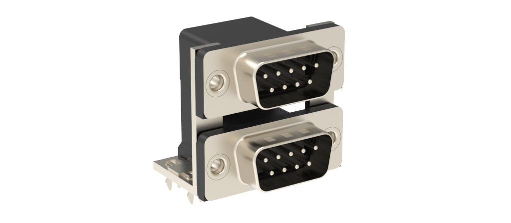 Dsub, Stamped Signal 3A, Dual Port Right Angle PCB Thru Hole, F=15.88mm (0.625in), 9/9 (Pin/Pin), Flash Gold, Bright Tin Shell, M3 Threaded Rear Insert, 4*Arrowhead Boardlock