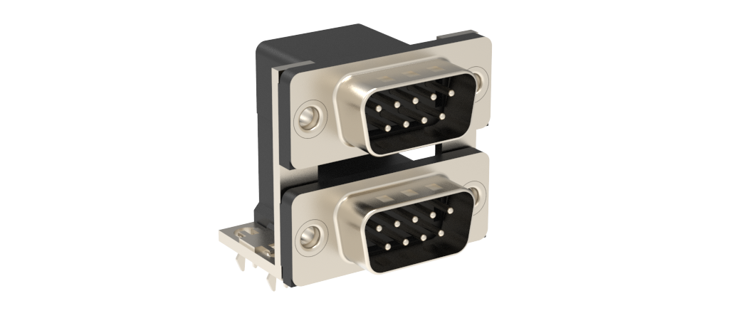 Dsub, Stamped Signal 3A, Dual Port Right Angle PCB Thru Hole, F=15.88mm (0.625in), 9/9 (Pin/Pin), 0.76m (30 in) Gold, Bright Tin Shell, M3 Threaded Rear Insert, 4*Arrowhead Boardlock