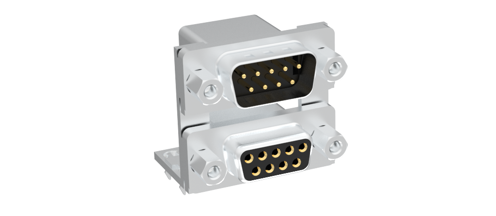 Dsub, Stamped Signal 3A, Dual Port Right Angle PCB Thru Hole, F=15.88mm (0.625in), 9/9 (Pin/Socket), Flash Gold, Bright Tin Shell, 4-40 Removable Front Screwlock, 4*Arrowhead Boardlock