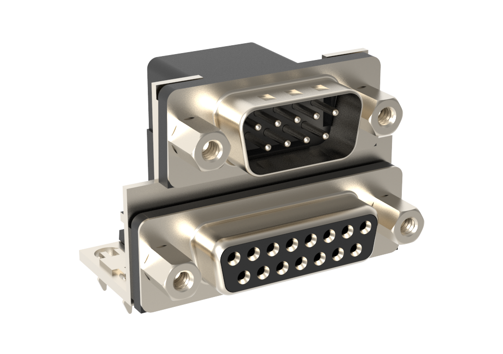 Dsub, Stamped Signal 3A, Dual Port Right Angle PCB Thru Hole, F=15.88mm (0.625in), 9/15 (Pin/Socket), 0.76m (30 in) Gold, Bright Tin Shell, 4-40 Removable Front Screwlock, 4*Arrowhead Boardlock