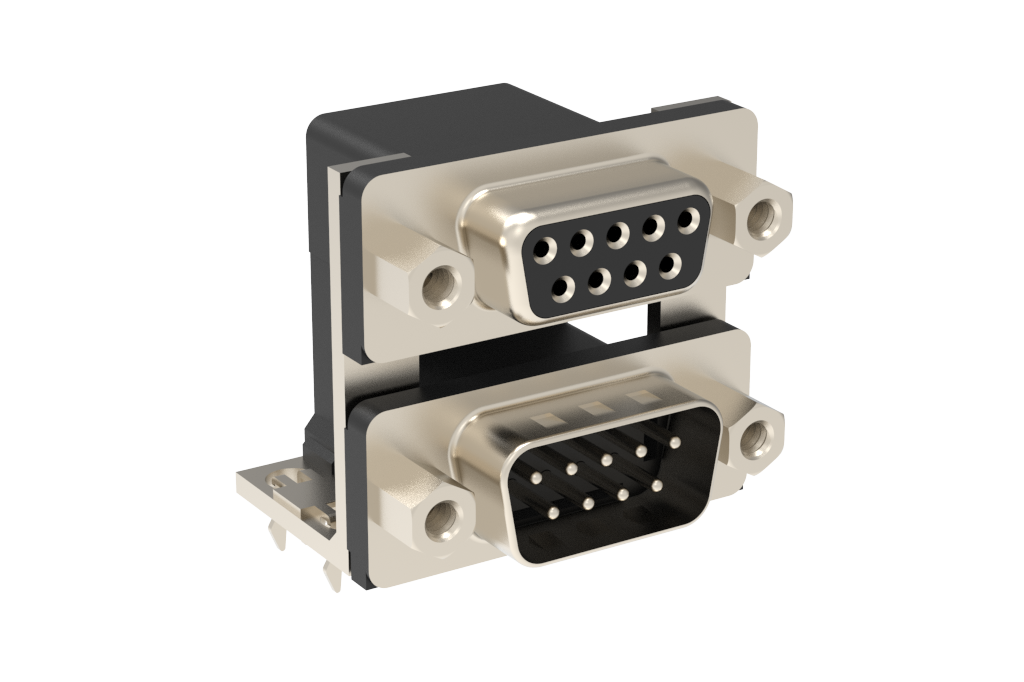 Dsub, Stamped Signal 3A, Dual Port Right Angle PCB Thru Hole, F=15.88mm (0.625in), 9/9 (Socket/Pin), Flash Gold, Nickel Shell, 4-40 Removable Front Screwlock (Hex H=4.8mm), 4*Arrowhead Boardlock