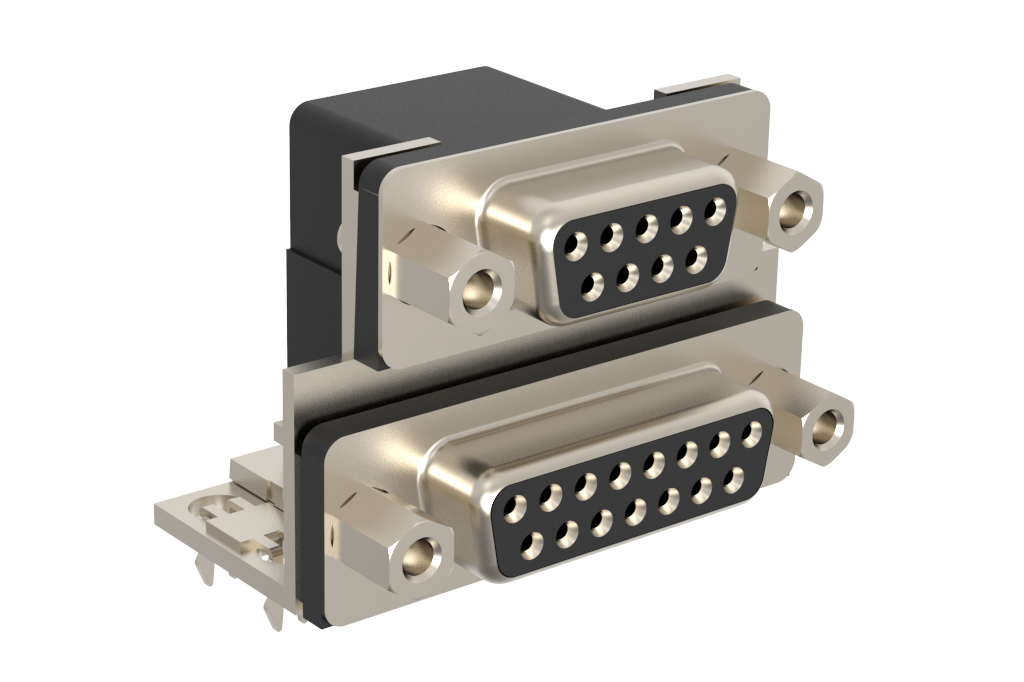 Dsub, Stamped Signal 3A, Dual Port Right Angle PCB Thru Hole, F=15.88mm (0.625in), 9/15 (Socket/Socket), Flash Gold, Bright Tin Shell, 4-40 Removable Front Screwlock, 4*Arrowhead Boardlock