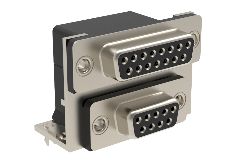 Dsub, Stamped Signal 3A, Dual Port Right Angle PCB Thru Hole, F=15.88mm (0.625in), 15/9 (Socket/Socket), 0.76m (30 in) Gold, Bright Tin Shell, 4-40 Threaded Rear Insert, 2*Arrowhead Boardlock