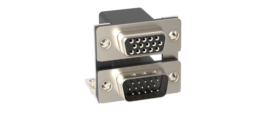 Dsub, Stamped Signal 3A, Dual Port Right Angle PCB Thru Hole, F=15.88mm (0.625in), 15 High Density/15 High Density (Socket/Pin), 0.38m (15 in) Gold, Bright Tin Shell, 4-40 Threaded Rear Insert, 2*Arrowhead Boardlock