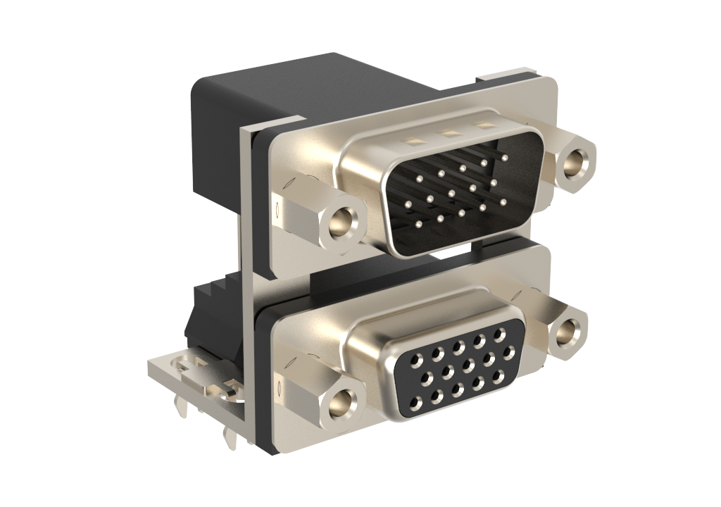 Dsub, Stamped Signal 3A, Dual Port Right Angle PCB Thru Hole, F=15.88mm (0.625in), 15 High Density/15 High Density (Pin/Socket), Flash Gold, Bright Tin Shell, 4-40 Removable Front Screwlock, 4*Arrowhead Boardlock