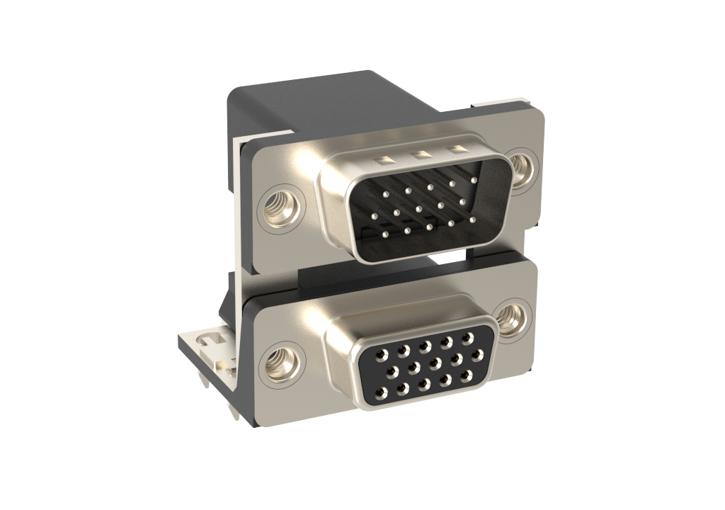 Dsub, Stamped Signal 3A, Dual Port Right Angle PCB Thru Hole, F=15.88mm (.625in), 15HD/15HD (Pin/Socket), Flash Gold, Nickel Shell, 4-40 Threaded Rear Insert, 4*Arrowhead Boardlock