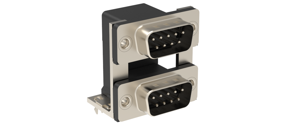 Dsub, Stamped Signal 3A, Dual Port Right Angle PCB Thru Hole, F=19.05mm (.750in), 9/9 (Pin/Pin), 0.38μm (15μin) Gold, Bright Tin Shell, 4-40 Threaded Rear Insert, 2*Arrowhead Boardlock