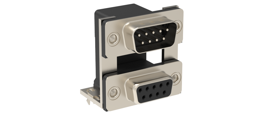 Dsub, Stamped Signal 3A, Dual Port Right Angle PCB Thru Hole, F=19.05mm (0.750in), 9/9 (Pin/Socket), Flash Gold, Bright Tin Shell, 4-40 Threaded Rear Insert, 2*Arrowhead Boardlock
