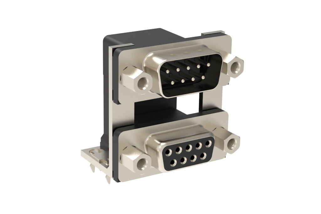 Dsub, Stamped Signal 3A, Dual Port Right Angle PCB Thru Hole, F=19.05mm (.750in), 9/9 (Pin/Socket), Flash Gold, Bright Tin Shell, 4-40 Fixed Front Screwlock, 4*Arrowhead Boardlock