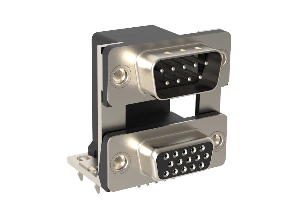 Dsub, Stamped Signal 3A, Dual Port Right Angle PCB Thru Hole, F=19.05mm (.750in), 9/15HD (Pin/Socket), Flash Gold, Bright Tin Shell, M3 Threaded Rear Insert, 4*Arrowhead Boardlock