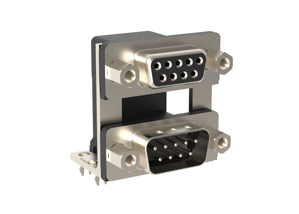 Dsub, Stamped Signal 3A, Dual Port Right Angle PCB Thru Hole, F=19.05mm (0.750in), 9/9 (Socket/Pin), 0.76m (30 in) Gold, Nickel Shell, 4-40 Fixed Front Screwlock, 4*Arrowhead Boardlock