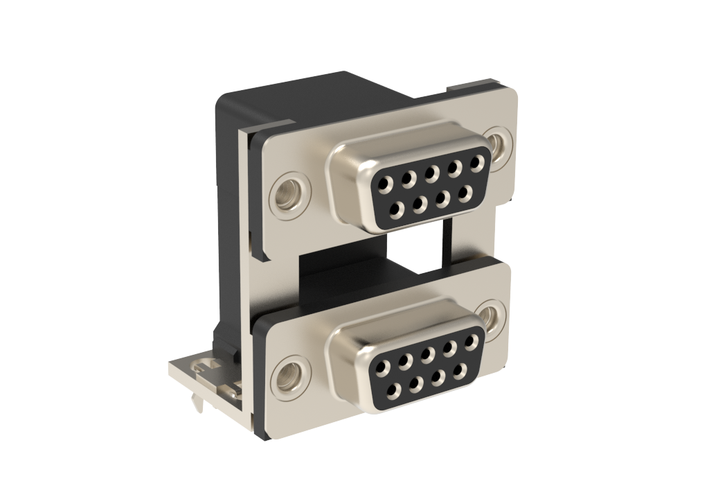 Dsub, Stamped Signal 3A, Dual Port Right Angle PCB Thru Hole, F=19.05mm (0.750in), 9/9 (Socket/Socket), Flash Gold, Bright Tin Shell, M3 Threaded Rear Insert, 2*Arrowhead Boardlock