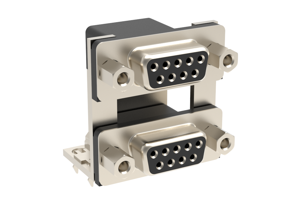 Dsub, Stamped Signal 3A, Dual Port Right Angle PCB Thru Hole, F=19.05mm (0.750in), 9/9 (Socket/Socket), 0.38m (15 in) Gold, Bright Tin Shell, 4-40 Removable Front Screwlock, 4*Arrowhead Boardlock
