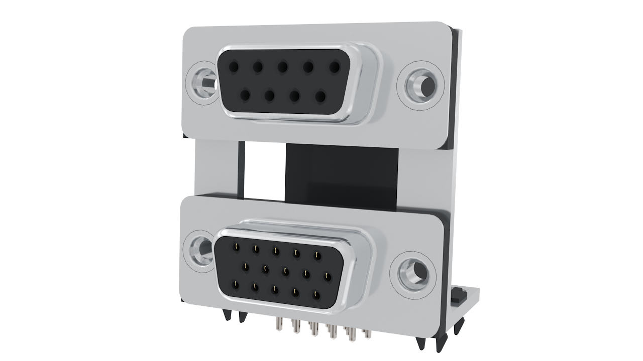 Dsub, Stamped Signal 3A, Dual Port Right Angle PCB Thru Hole, F=19.05mm (0.750in), 9/15 High Density (Socket/Socket), Flash Gold, Bright Tin Shell, 4-40 Threaded Rear Insert, 4*Arrowhead Boardlock
