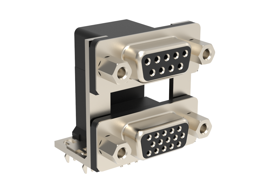 Dsub, Stamped Signal 3A, Dual Port Right Angle PCB Thru Hole, F=19.05mm (0.750in), 9/15HD (Socket/Socket), Flash Gold, Bright Tin Shell, 4-40 Fixed Front Screwlock, 4*Arrowhead Boardlock