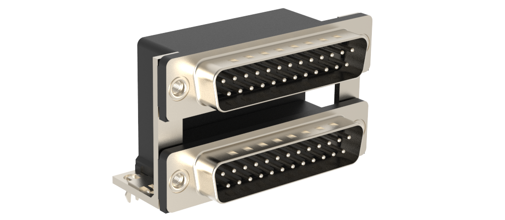 Dsub, Stamped Signal 3A, Dual Port Right Angle PCB Thru Hole, F=19.05mm (0.750in), 25/25 (Pin/Pin), 0.76m (30 in) Gold, Bright Tin Shell, 4-40 Threaded Rear Insert, 2*Arrowhead Boardlock