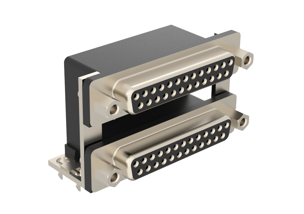 Dsub, Stamped Signal 3A, Dual Port Right Angle PCB Thru Hole, F=19.05mm (0.750in), 25/25 (Socket/Socket), 0.38m (15 in) Gold, Bright Tin Shell, 4-40 Removable Front Screwlock, 4*Arrowhead Boardlock