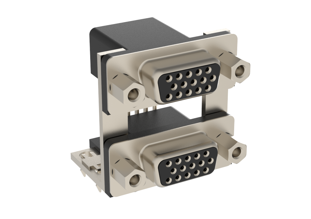 Dsub, Stamped Signal 3A, Dual Port Right Angle PCB Thru Hole, F=19.05mm (0.750in), 15HD/15HD (Socket/Socket), Flash Gold, Nickel Shell, 4-40 Removable Front Screwlock, 4*Arrowhead Boardlock