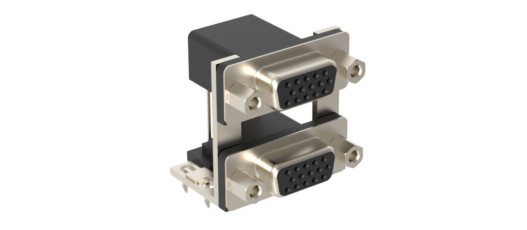 Dsub, Stamped Signal 3A, Dual Port Right Angle PCB Thru Hole, F=19.05mm (0.750in), 15HD/15HD (Socket/Socket), 0.76m (30 in) Gold, Nickel Shell, 4-40 Removable Front Screwlock, 4*Arrowhead Boardlock, High Temp