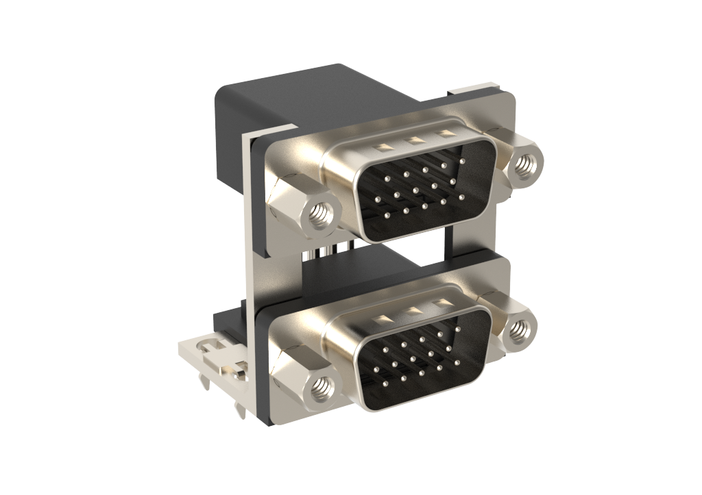Dsub, Stamped Signal 3A, Dual Port Right Angle PCB Thru Hole, F=19.05mm (0.750in), 15HD/15HD (Pin/Pin), Flash Gold, Nickel Shell, 4-40 Removable Front Screwlock, 4*Arrowhead Boardlock