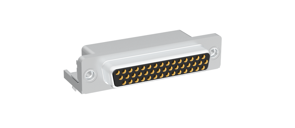 Dsub, Stamped Signal 3A, Right Angle PCB Thru Hole, High Temp High Density, FP=8.89mm (0.350in), 44 Socket, Bright Tin Shell, 0.76m (30 in) Gold, 4-40 Rear Insert, Ground Tab& Boardlock, Plastic Tray, Closed Back