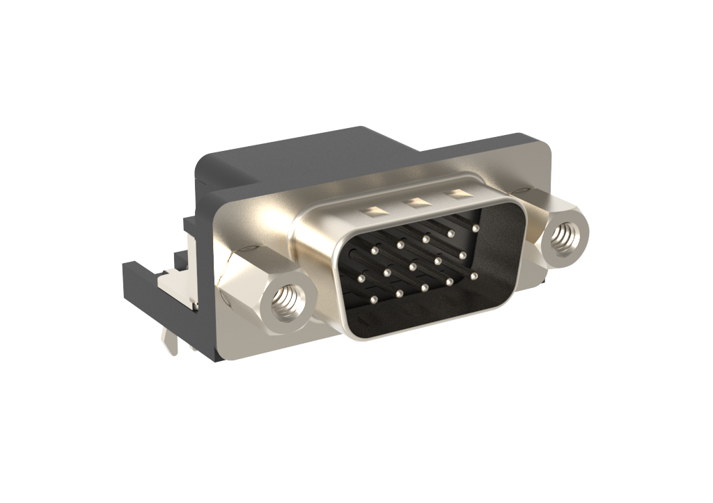 Dsub, Stamped Signal 3A, Right Angle PCB Thru Hole, High Temp High Density, FP=8.89mm (0.350in), 15 Pin, Bright Tin Shell+Grounding Dimples, Flash Gold, 4-40 Removable Front Screwlock, Ground Tab& Boardlock, Plastic Tray, Closed Back