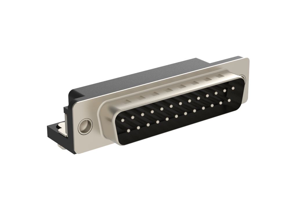 Dsub, Stamped Signal 3A, Right Angle PCB Thru Hole, High Temp Std Density, FP=8.08mm (0.318in), 25 Pin, Bright Tin Shell+Grounding Dimples, 0.76m (30 in) Gold, 4-40 Rear Insert, Ground Tab& Boardlock, Plastic Tray, Closed Back